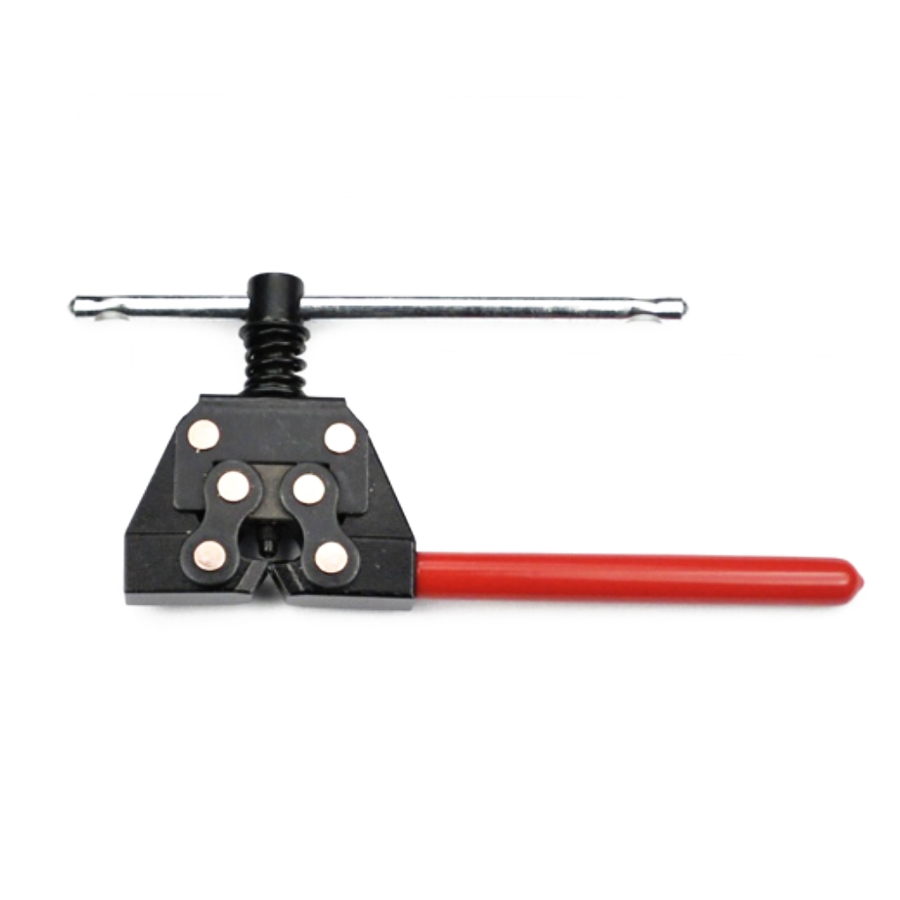 Ruotando la leva metallica il perno catena viene prima de-rivettato e poi viene pressato fino a liberare la catena.
