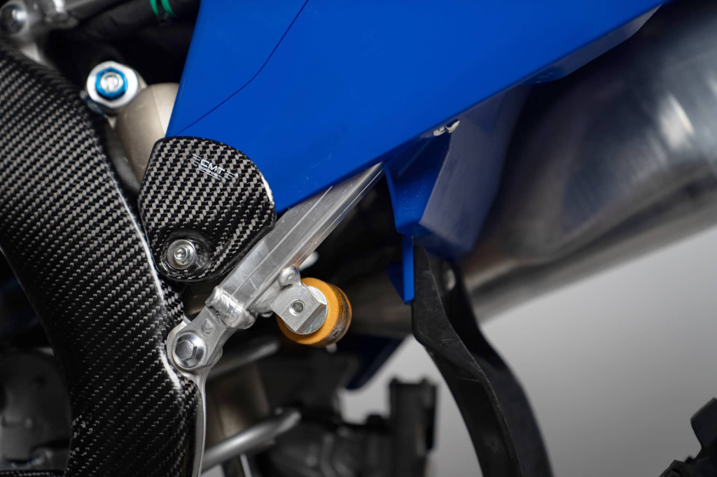 Protezioni adesivi tabelle posteriori realizzate in carbonio per i modelli Yamaha YZF 250 2024 - 2025 al fine di prevenire il celere deterioramento delle grafiche adesive e/o probabili rigature causate dallo sfregamento dello stivale a contatto con la parte iniziale della tabella.