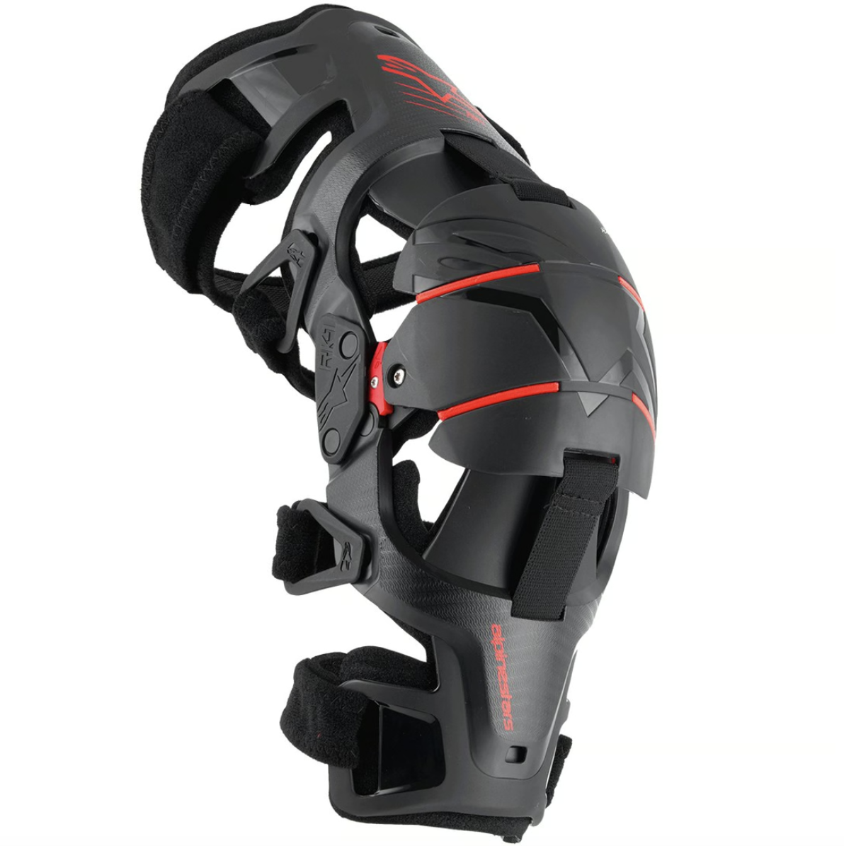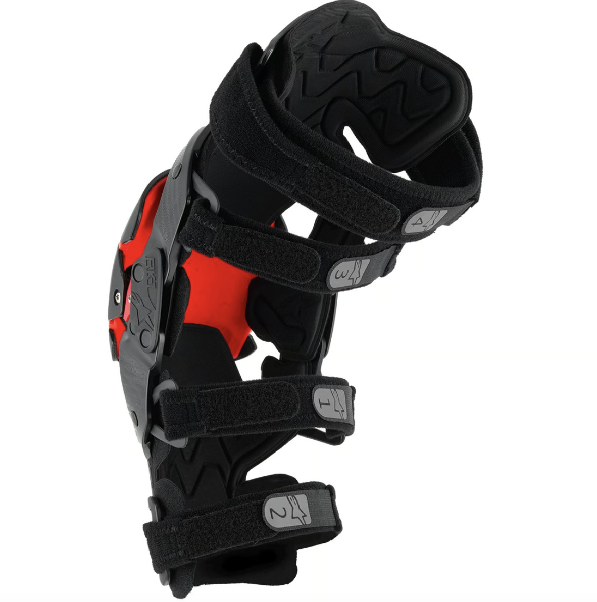 Dotato di quattro cinghie individuali rinforzate con materiale antiscivolo per garantire che la ginocchiera rimanga saldamente in posizione durante la guida.