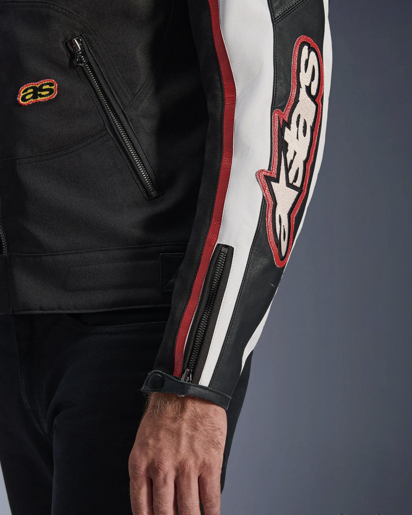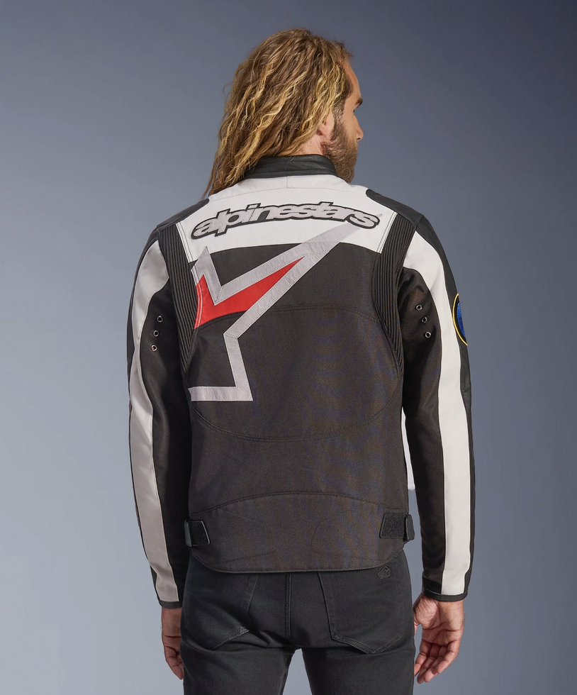 Eredità Racing Alpinestars: Un logo Alpinestars avvolgente, patch con marchio, una scritta ricamata e tiranti e bottoni a pressione con marchio, infondono alla giacca un contrasto audace e stile, permettendo ai motociclisti di esprimere la loro affinità con il marchio.
