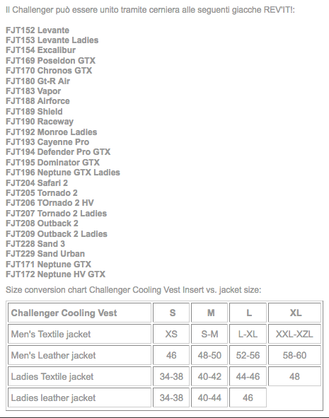 NOVITA' ASSOLUTA!!!UN GILET RINFRESCANTE DA INDOSSARE SOTTO LA TUA GIACCA REV'IT !!!Questo gilet va immerso nell'acqua e poi strizzato.Una volta che il gilet Challenger è saturato dall’umidità, le sue proprietà rinfrescanti naturali si attivano semplicemente aprendo i pannelli di ventilazione della giacca: ciò aiuta il motociclista a mantenere una temperatura del corpo confortevole e di riflesso, rimanere reattivo. Il gilet Challenger può essere ancorato sulle cerniere di alcune giacche REV’IT! fornendo una vestibilità integrata e amplificando il flusso d’aria nella giacca fino a sei ore.Il Challenger può essere unito tramite cerniera alle seguenti giacche REV'IT!:GalacticGalactic LadiesSand 2Sand 2 HVLevanteLevante LadiesExcaliburOutbackSandVentura LadiesIstruzioni per l’uso di prodotti rinfrescanti con Hyperkewl™Prima del primo utilizzo, immergere l’articolo nell’acqua, strizzarlo gentilmente e lasciarlo asciugare completamente. Ciò è necessario per attivare le fibre rinfrescanti.Notare che l’articolo dopo la prima attivazione può sembrare viscido per via della migrazione delle fibre. Questa sensazione va tuttavia persa all’ immersione successiva.