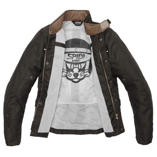 Si presta all'uso cittadino come anche alle cavalcate con moto d'epoca. Una particolarità di questa giacca: all'interno sulla fodera traforata è stampato il vecchio logo della Spidi, il gatto con il casco, che è inciso anche su tutti gli automatici della giacca.