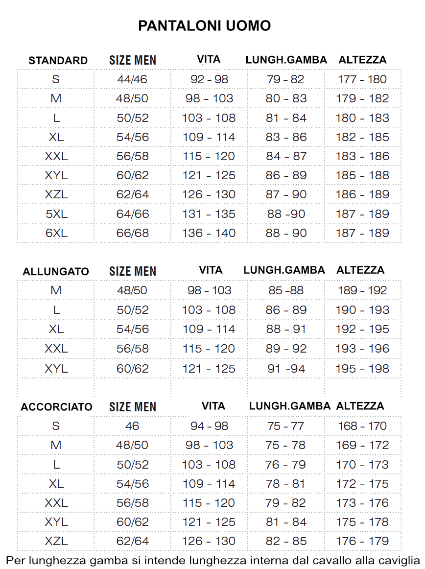 Nota: Consigliamo alle donne di ordinare una taglia in meno rispetto a quella che acquistano abitualmente.