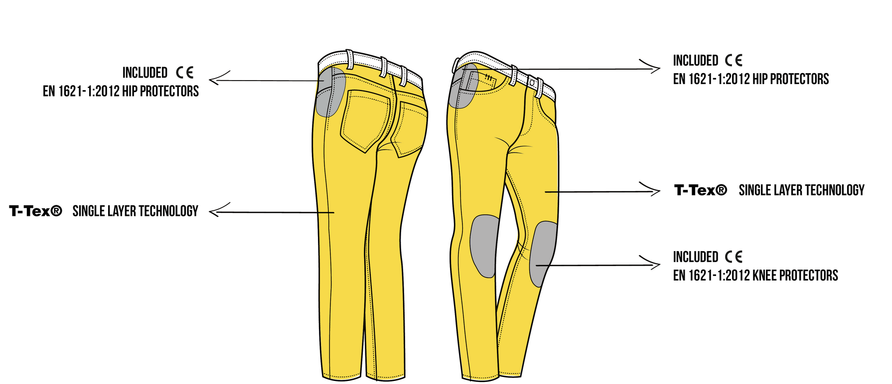 -Il jeans con protezioni SARA è prodotto nelle taglie dalla 25 alla 38 (Tg. americana)