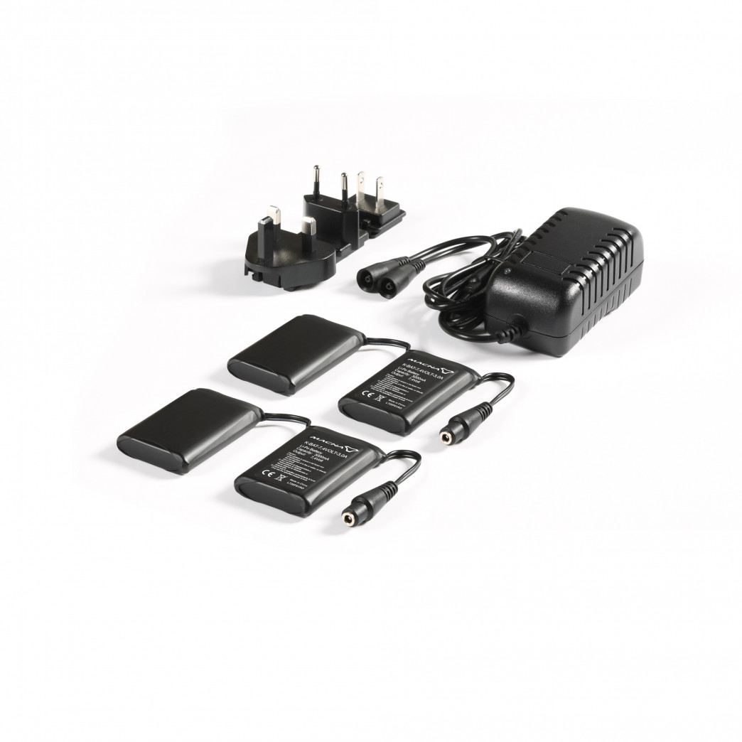 KIT BATTERIA per guanti e calze Macna, formato da una coppia di batterie 7,4 volt 3000 mA e da un caricabatterie capace di ricaricare entrambe le batterie con una corrente di 2000mA.